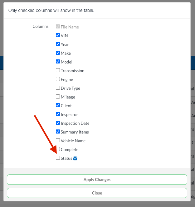 - This will bring up the list of available columns to show on this page. If you would like Inspection Status to show, make sure that the box next to "Status" is checked. If not, make sure it's not checked.
